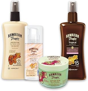 Hawaiian Tropic Beauty PACK - Kit avec Spray Bronzant à l'Huile Sèche SPF 15 + Crème Solaire Protection Satin SPF 15 + Crème Visage Hydratante Soie SPF 30 + Beurre Corps Après Soleil Sun Coco