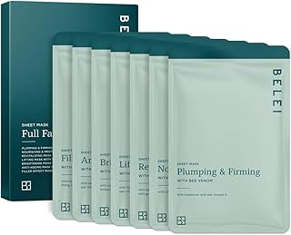 Marque Amazon - Belei - Soin complet visage masque tissu - 7 masques (Repulpant et raffermissant, Nourrissant et protecteur, Revitalisant, Liftant, Illuminant, Anti-âge, Effet combleur)